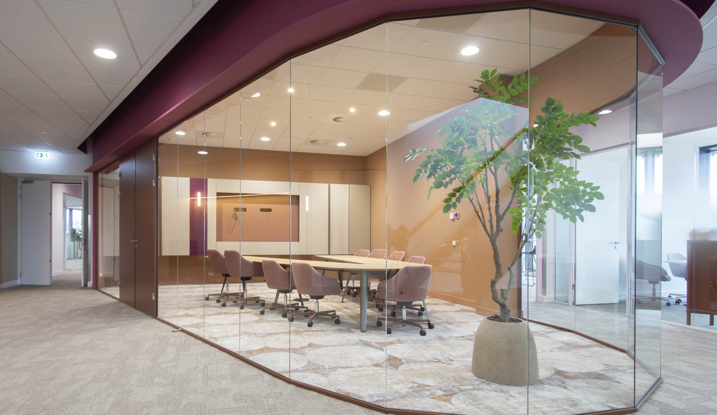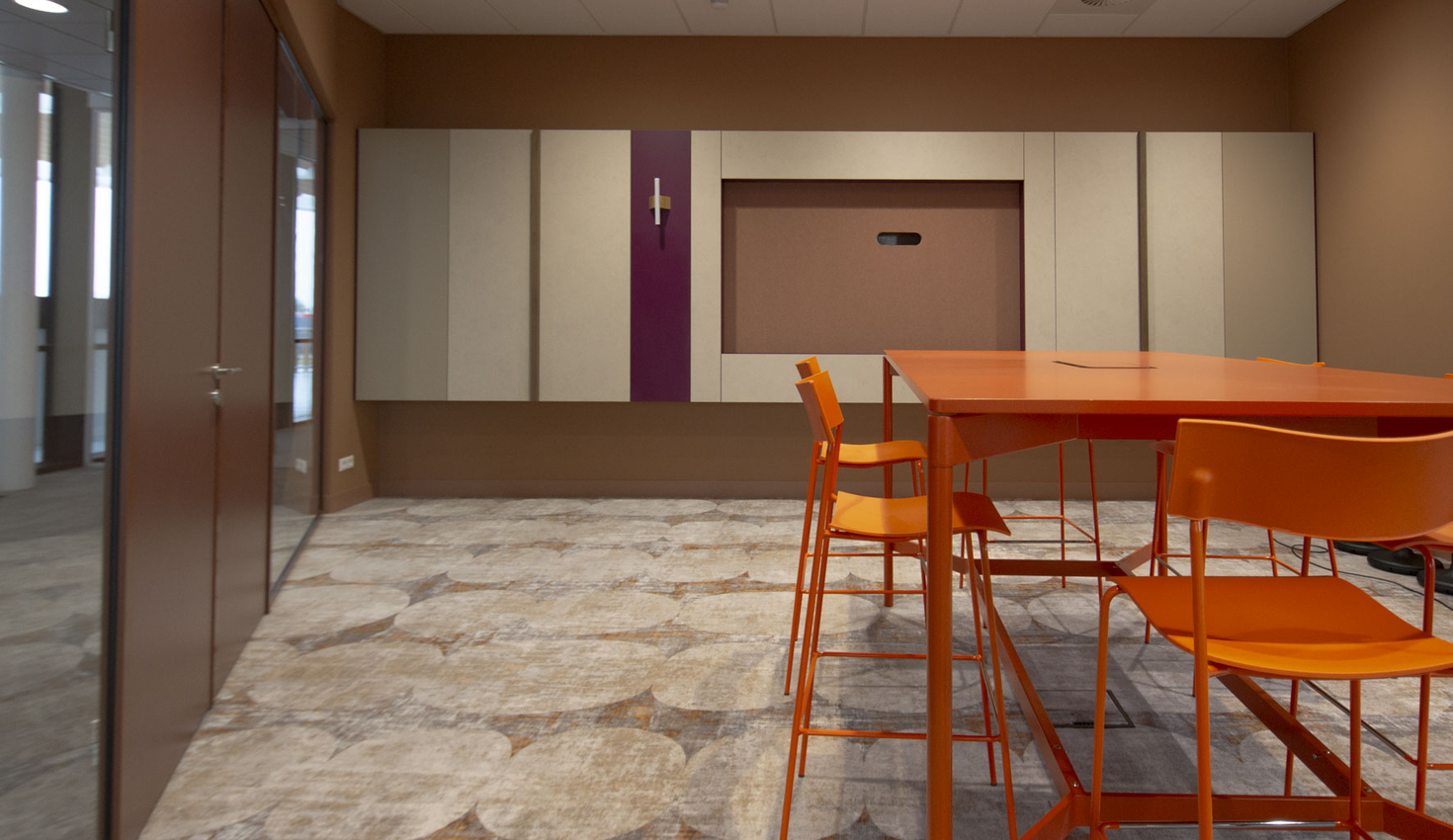 Gesloten oogt de ruimte rustig, geopend is alles direct functioneel. Materialen zoals PETfelt dragen bij aan een goede akoestiek en een zachter totaalbeeld.